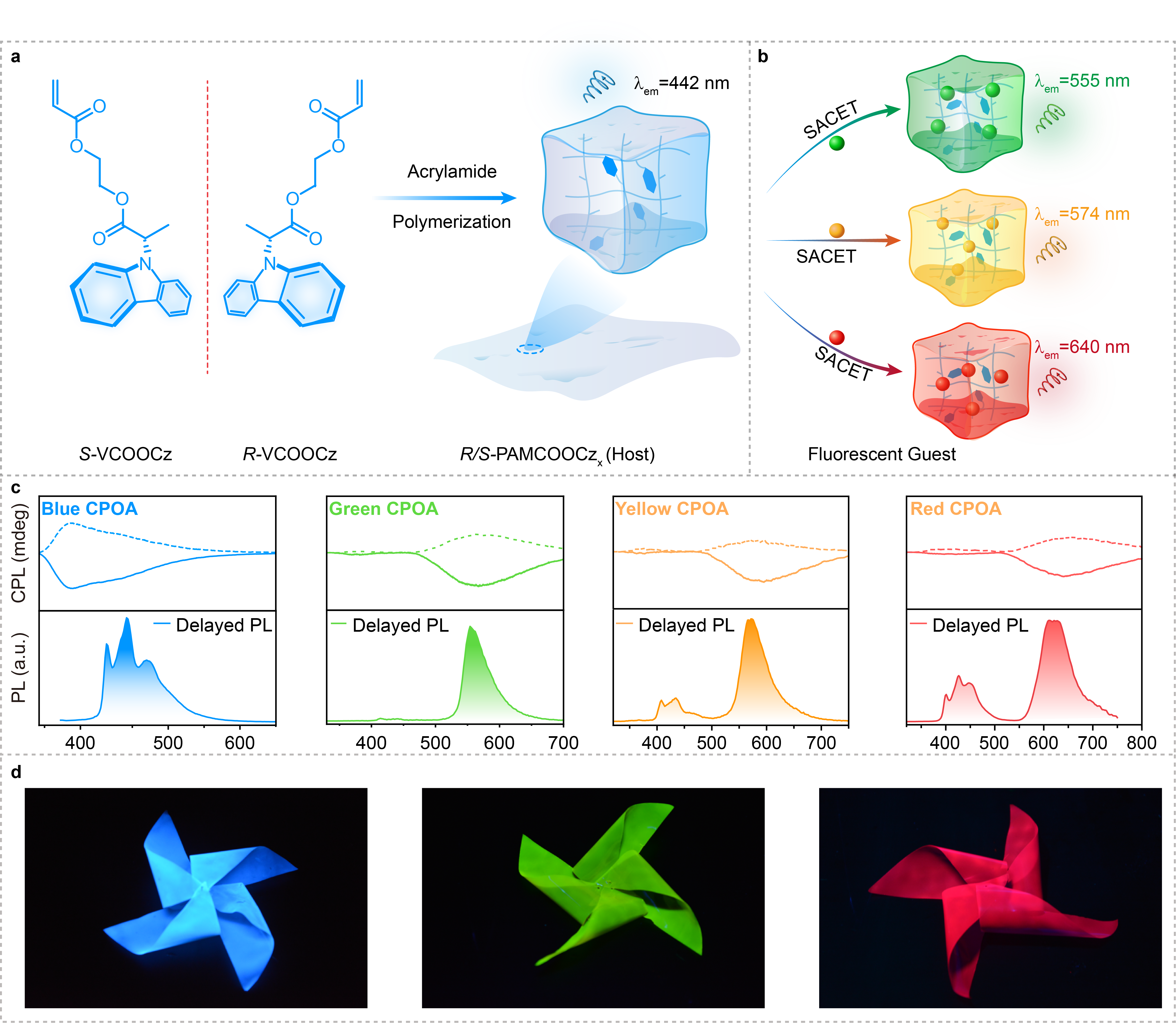有机电子与信息显示国家重点实验室黄维院士团队陶冶和陈润锋教授在手性有机长余辉领域取得新进展,提出了一种通过共价自限域手性发色团来获得蓝色手性长余辉的简单方法,设计出具有超长寿命、高发光不对称因子的蓝色手性有机长余辉聚合物。将蓝色手性余辉聚合物作为主体与荧光客体共混,利用余辉和手性协同能量传递策略,成功地实现了全彩手性余辉发射体系的构建,并探索了该类材料在信息加密、立体显示等领域的应用。4月9日,相关成果以“Enabling robust blue circularly polarized organic afterglow through self-confining isolated chiral chromophore”为题发表在Nature Communications(《自然•通讯》)上。91吃瓜