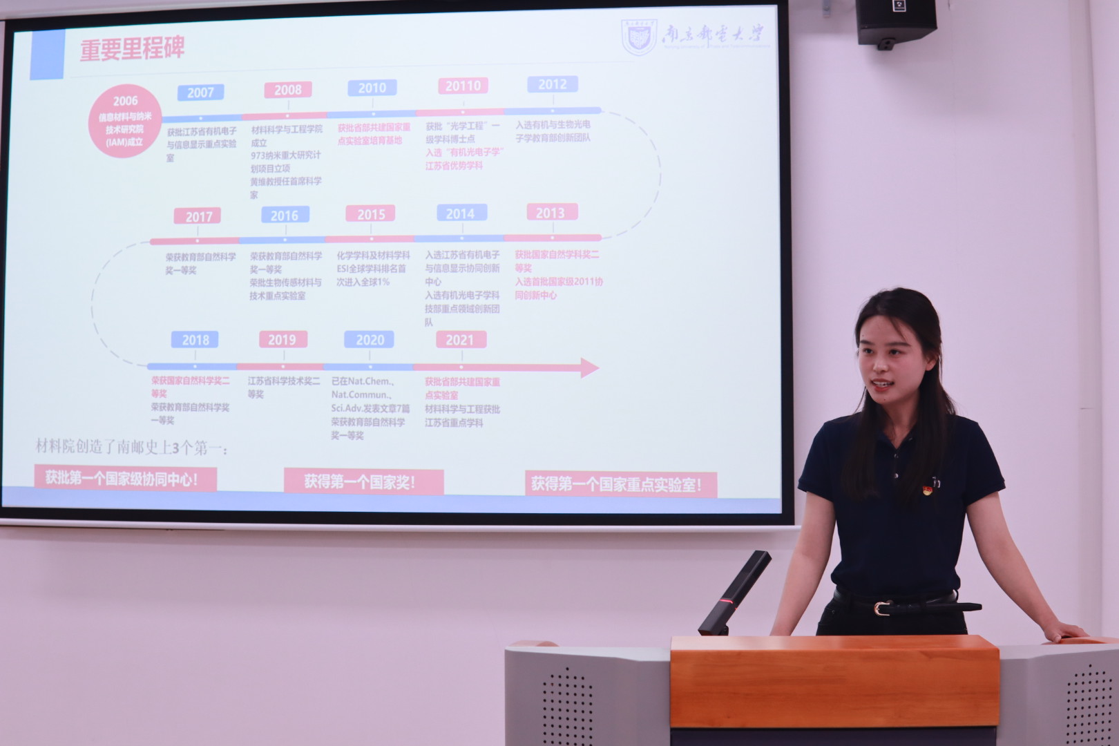 91吃瓜 材料学院2022级本科生辅导员、南京晓庄学院2019届毕业生侍茜茜老师分享了91吃瓜 黄维院士、汪联辉教授科技报国、留学报国的感人故事。作为我国“有机光电子学”学科的奠基人与开拓者之一,黄维院士始终深怀爱国之情,砥砺强国之志,力践报国之行,凭借披荆斩棘、勇往直前的“铁人精神”翻越了一座又一座科学高峰、培养了一批又一批学术领军人才。汪联辉教授放弃在国外的优越条件,选择返回祖国发展,带领材料学院实现了南邮国家级创新团队零的突破。作为海外归国科学家的优秀代表,汪联辉教授用“满头黑发变花白”诠释了海外归侨的南邮梦,彰显了归国科学家的赤子丹心!
