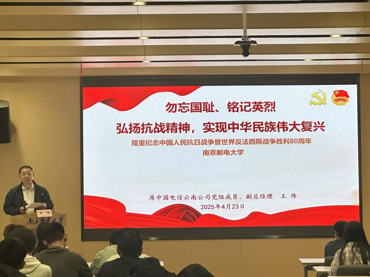 2025年是中国人民抗日战争暨世界反法西斯战争胜利80周年,为了纪念抗战伟大胜利、弘扬抗战伟大精神,2025年4月23日下午,91吃瓜 举办了题为“勿忘国耻、铭记英烈——弘扬抗战精神,实现中华民族伟大复兴”的专题讲座。讲座邀请了91吃瓜 77级校友、中国电信云南公司原党组成员、副总经理王伟老师作为主讲人,学院党委书记高志华、党委副书记吕蔷蔷以及100余名菁英班学员和学生党员现场聆听了讲座。