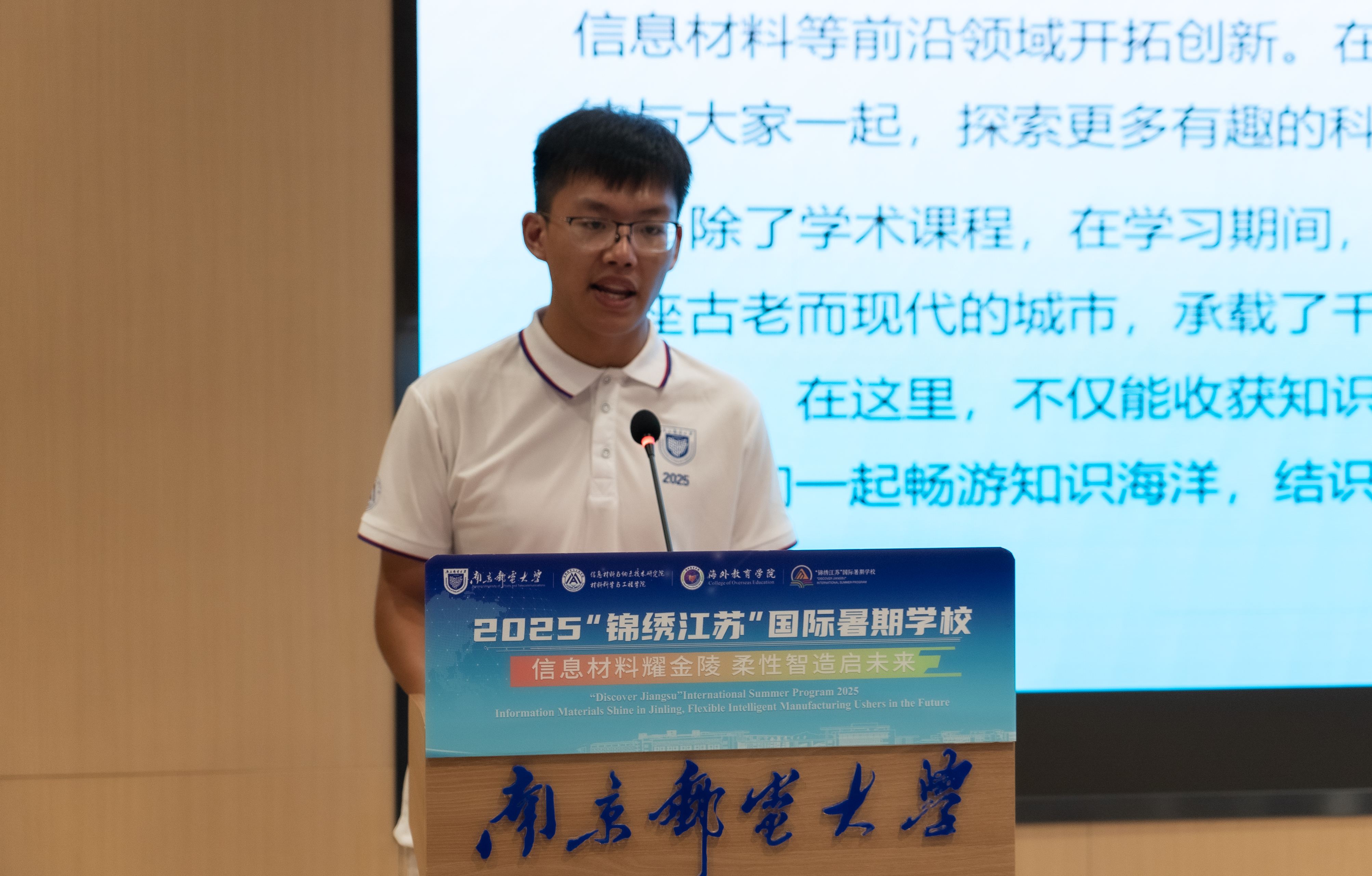 南邮91吃瓜 周千瑞作为中国学员代表发言。他诚挚邀请中外学员一同深入探索南京,领略其历史底蕴与文化魅力,并在信息材料与柔性电子领域学术交流中汲取学科前沿知识,携手合作、共同进步,通过交流搭建友谊桥梁,促进国际理解与共赢。