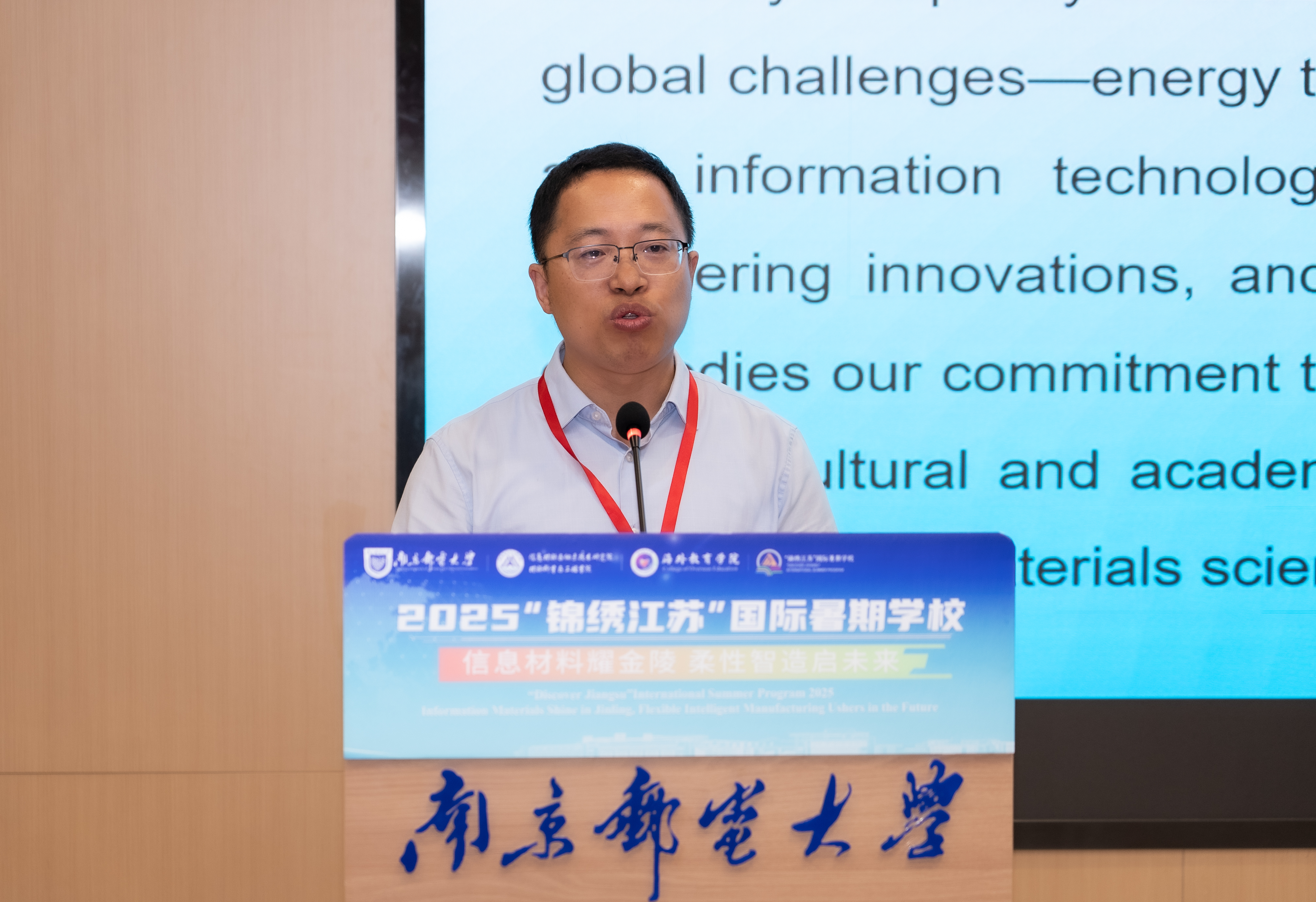 在致辞中,刘青山副校长介绍了南邮电子信息办学特色、学科建设以及国际交流合作情况。他指出,南邮在不断推进电子信息领域的研究与教育的同时,十分重视国际交流与合作。本次“锦绣江苏”国际暑期学校以“信息材料耀金陵,柔性智造启未来”为主题,通过学术讲座、实验实践和文化考察等活动,帮助中外学员深入理解信息材料与柔性电子领域基础知识、前沿发展趋势,拓宽学术视野。同时,为中外青年学者相互交流、学习和分享搭建平台,促进跨文化理解与合作。他希望,大家能够积极参与,广泛交流,深入思考,通过国际暑期学校提升个人学术水平和综合素养,收获宝贵的友谊,建立长久的学术合作关系。
