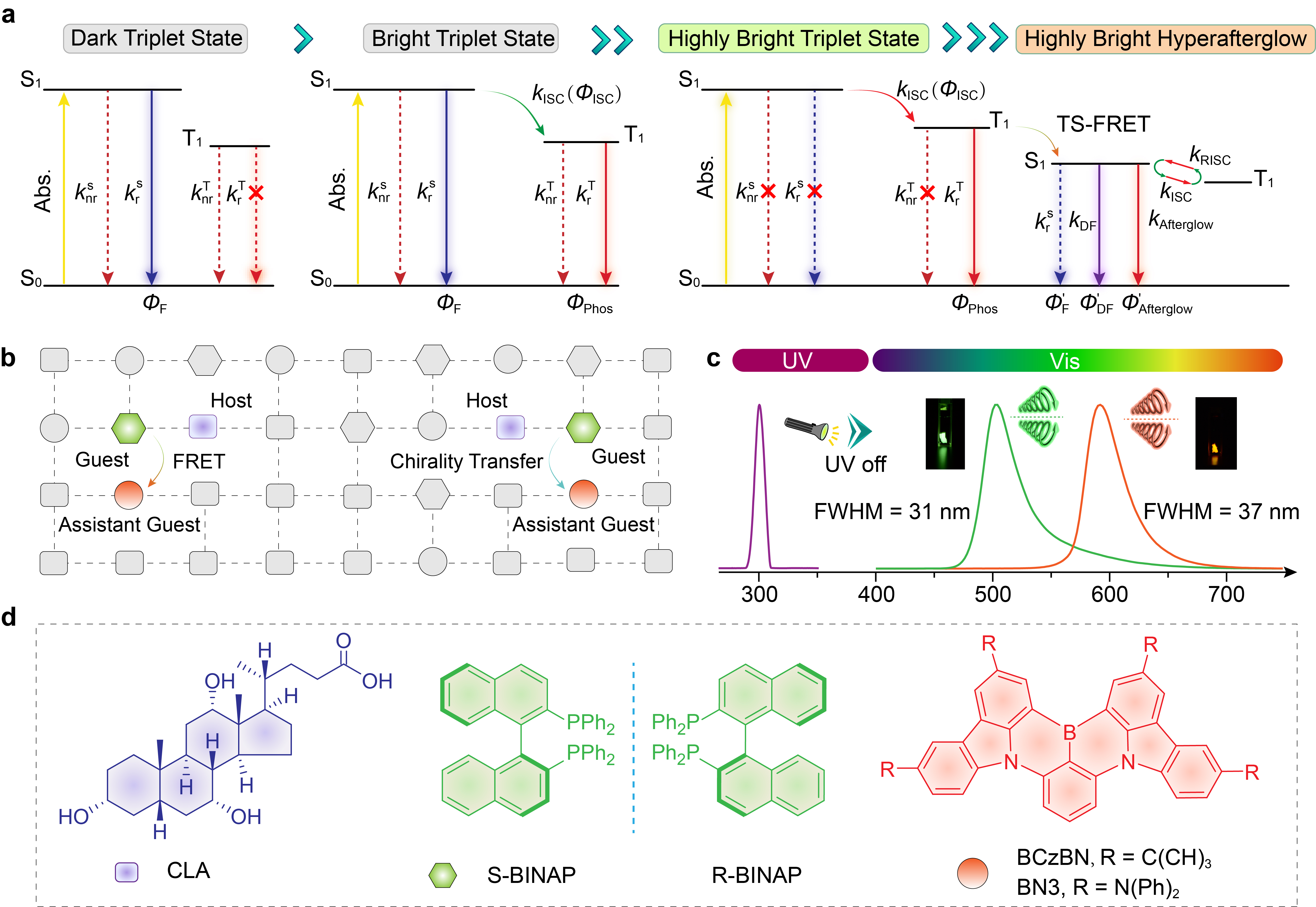 长余辉材料是一种具有持续发光特性的材料,在光电子领域中有重要的应用潜力。其中,有机室温磷光(RTP)是实现长余辉发光的一种重要方式,然而,RTP通常受限于低色纯度、低发光亮度、低效率。这是由于RTP发射的固态/三重态发光特性,T1→S0跃迁过程中较大的结构弛豫,调控普通有机分子的“暗三重态”至“亮三重态”的难度,以及长寿命三重激子极易受到猝灭的影响。