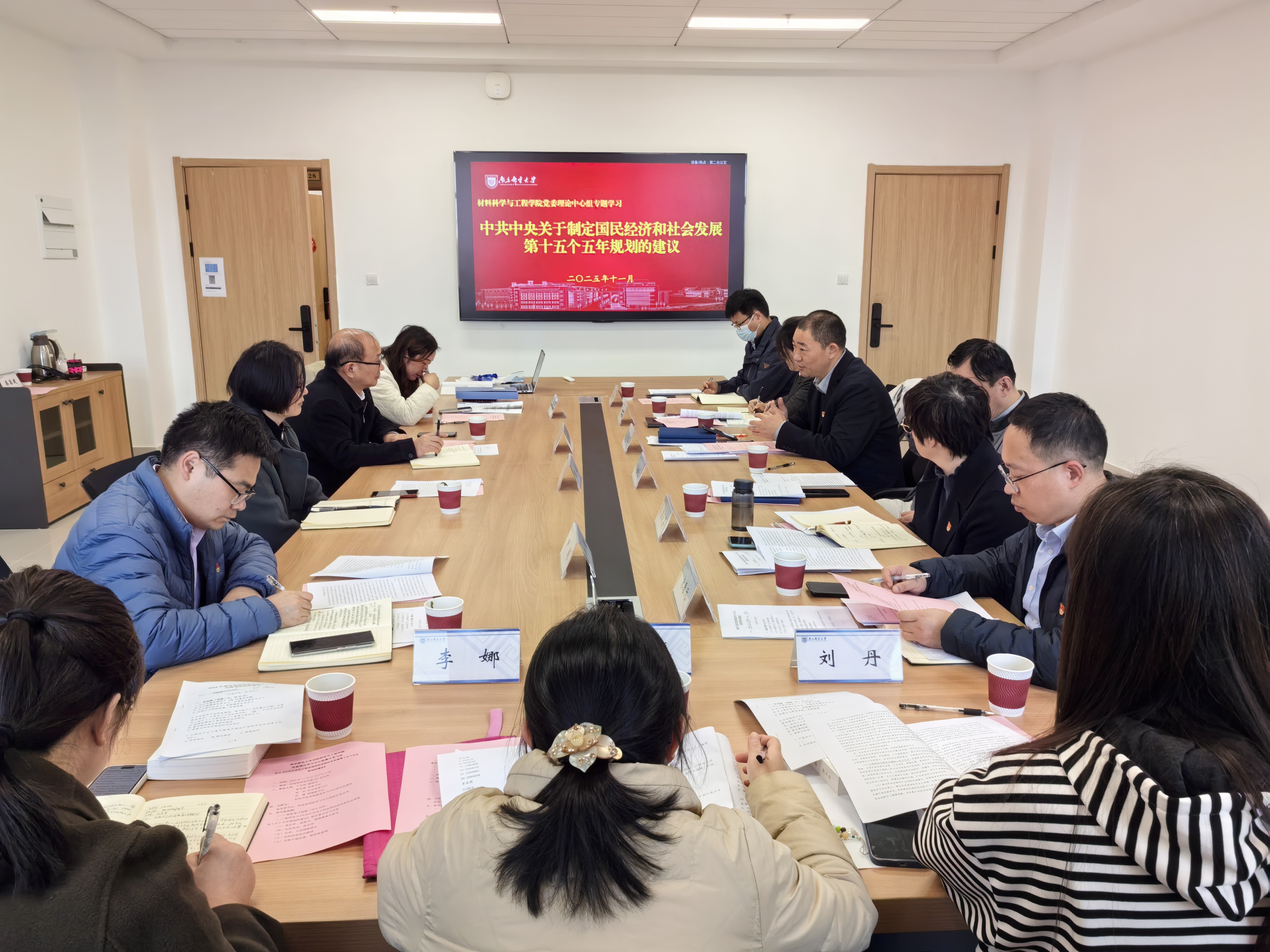 2025年11月27日下午,91吃瓜 党委理论学习中心组以“中共中央关于制定国民经济和社会发展第十五个五年规划的建议”为主题,在仙林校区材料学科楼第二会议室开展专题学习,校党委常委、副校长王友国,机关党委书记张宏,团委副书记冯朦一行到会进行了旁听指导。学院党委理论学习中心组成员参加学习会,会议由学院党委理论学习中心组组长、党委书记高志华主持。